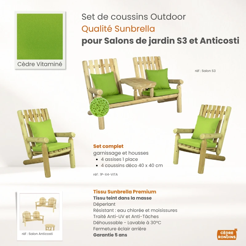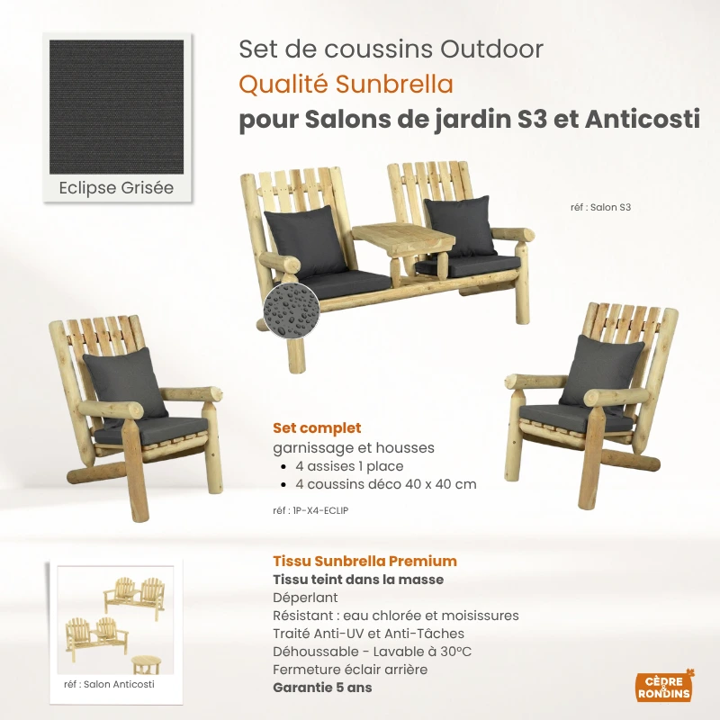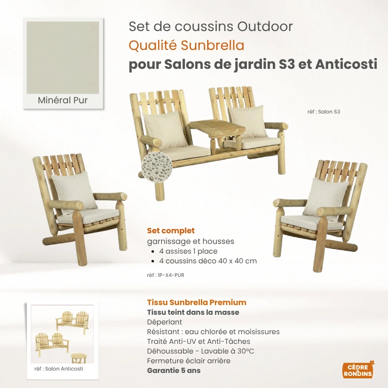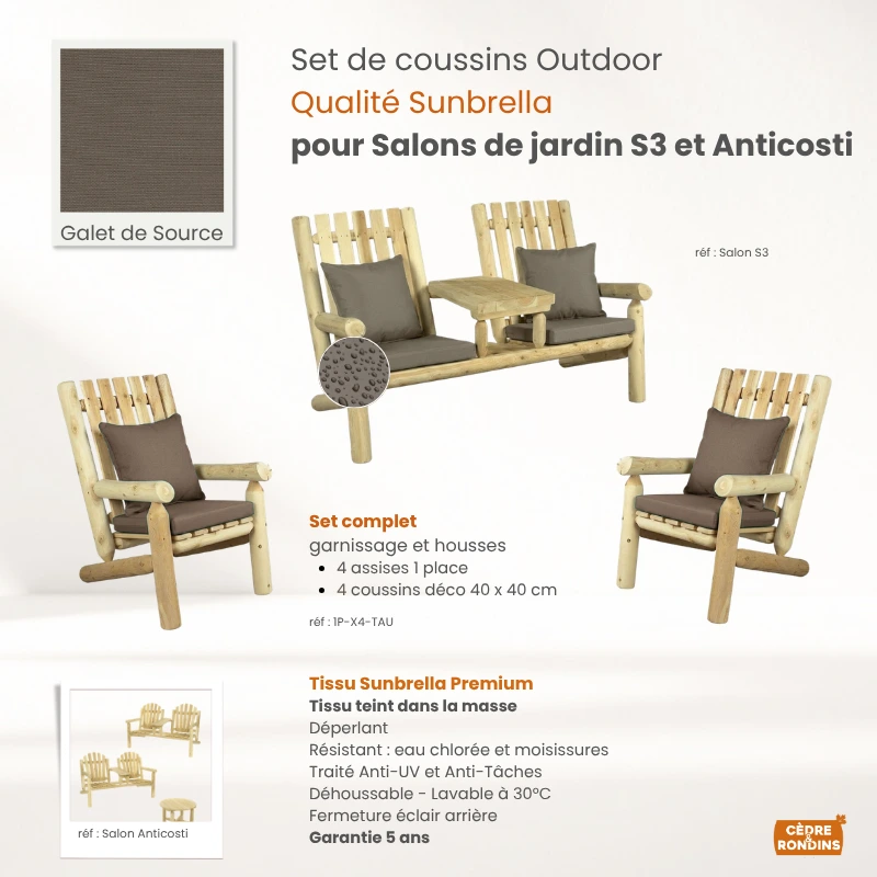| Coloris Coussins Outdoor | Minéral Pur, Galet de Source, Eclipse Grisée, Rivage Canadien, Bord de Lac, Forêt Boréale, Cèdre Vitaminé, Miel d'Erable, Eté Indien, Terre de Feu |